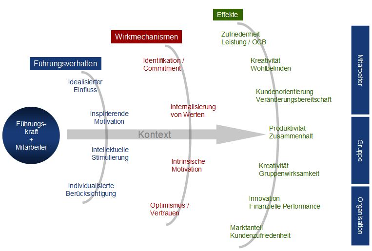 - Idealisierter Einfluss: Als Vorbilder wahrgenommen, respektiert und bewundert werden, zuverlässig sein, das Vertrauen der Mitarbeiter genießen und hohen moralischen Ansprüchen gerecht werden.